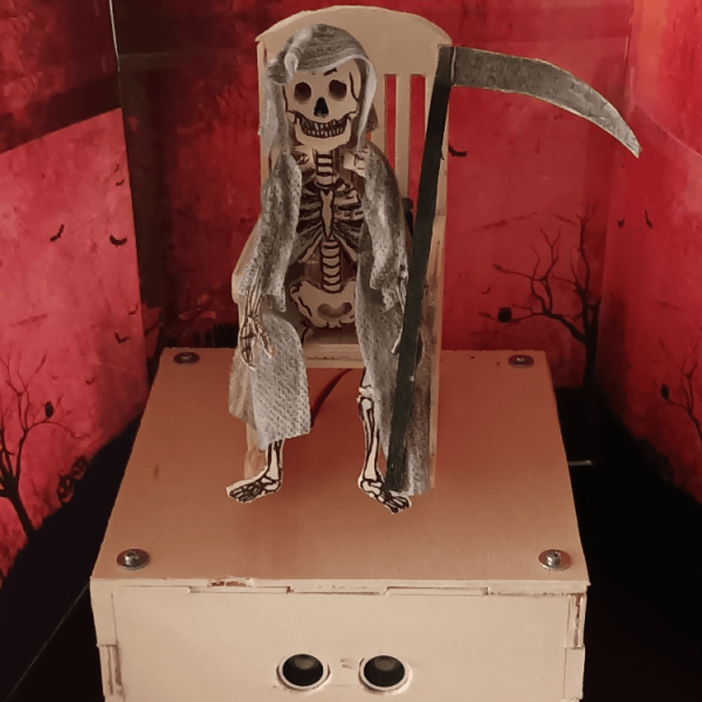 With the Halloween skeleton project set Build your own interactive spooky decoration - perfect for technology fans, makers and Halloween lovers! This set combines electronics, mechanics and creativity to create an impressive effect: the skeleton sits on a rocking chair, moves back and forth automatically and reacts when approached. If the ultrasonic sensor detects a person, the red LED eyes light up, the skeleton straightens up and emits an eerie laugh via the DFPlayer Mini.